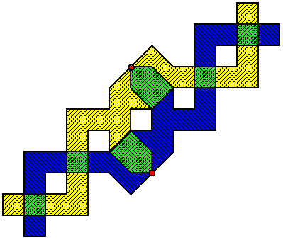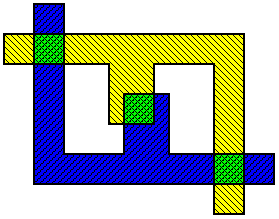 | Grünbaum's rotated F's. A (2k+1)-fold 2-Venn diagram with rotational symmetry. Shown with k = 1. Additional twists of both ends give larger values of k. | Another Grünbaum example. A 2k-fold 2-Venn diagram with rotational symmetry. Shown with k = 3. Additional twists/untwists of both ends give other values of k. Note that the curves passing through the red vertices do not meet transversally. |