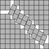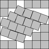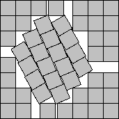 In 1997, I improved the packing for 37 squares using a modified diagonal strip of width 3. In 2002, David Cantrell improved this slightly (see Figure 16) [14]. The slanted squares are tilted at angles of approximately 42.086o and 45o. Adding an ``L'' to this packing of 37 squares gives the best known packing of 50 squares.
